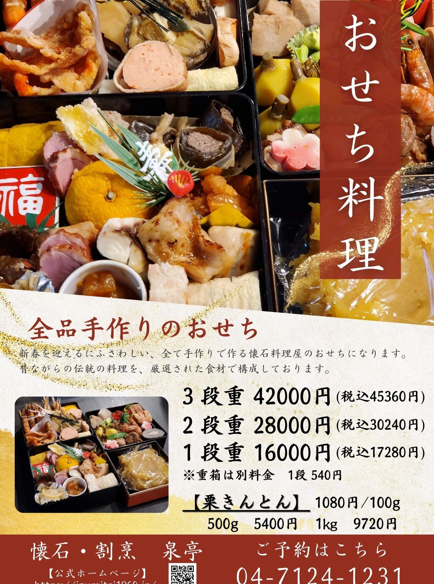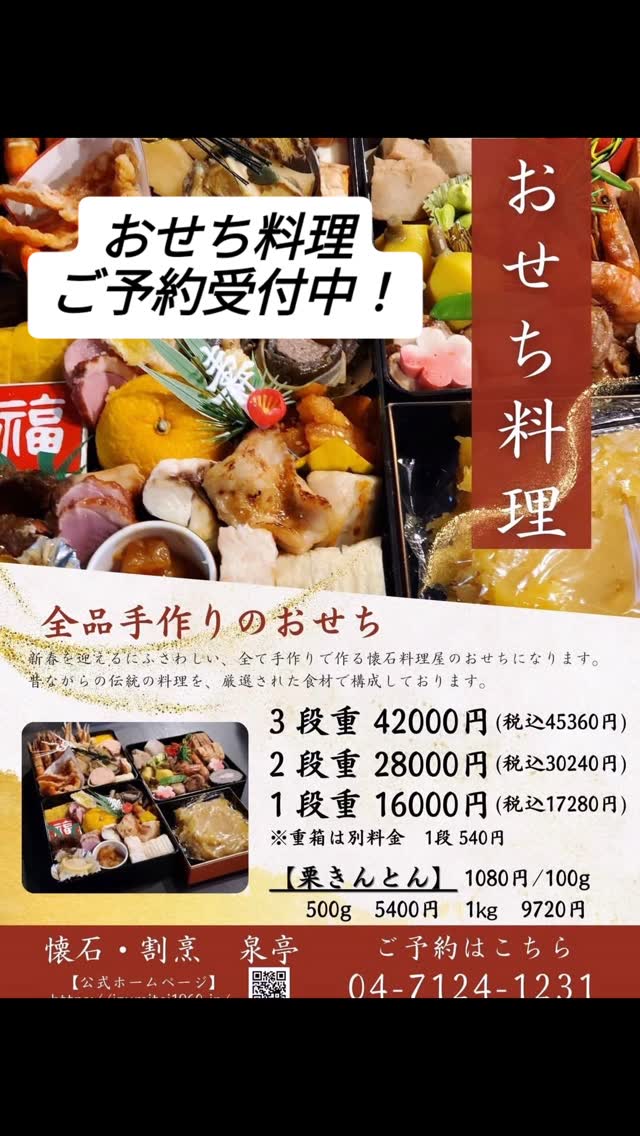 【おせちのご予約】 いつも当店をご利用いただきまことにありがとうございます。 本年も12月31日おせち料理を行います! 新年を特別な料理で盛大にお祝いいたしませんか? おせち料理には神様へのお供えの意味がございます。お供えを一緒に食すことでご利益にあずかっております。 おせち料理の食材には「五穀豊穣」や「無病息災」などを願う食材が使われます。 また重箱に料理を詰めるのは「めでたさを重ねる」という意味が込められております。 どうしても数に限りがございますので、ご予約は先着順とさせていただきます。 お早めにご予約いただけると幸いです。 おせちは12月31日にテイクアウトもしくは配達いたします。 (配達は昨今のガソリン高騰により距離に制限がございます) また、当店自慢の栗きんとんも販売いたします! 栗きんとんのみのご予約も可能となっております。栗きんとんのみの場合は12月31日以前のお渡しもしております。 たくさんのご予約をお待ちしております! ご予約・お問い合わせはTEL・ホームページ・InstagramのDMにて受け付けております。 お気軽にお問い合わせくださいませ。 #日本料理 #懐石料理 #レストラン #老舗 #千葉県 #野田市 #愛宕駅 #野田市駅 #コース料理 #ランチ #ディナー #出前 #個室 #完全個室 #テーブル #掘りごたつ #隠れ家 #新年会#忘年会#接待#法事#顔合わせ#お喰い初め#七五三 #季節の料理 #旬の食材 #おせち ―――――――――――――――――――――――――― 懐石・割烹 泉亭 住所:千葉県野田市中野台265 Tel;04-7124-1231 ホームページ:https://izumitei1960.jp/ ヒトサラサイト:https://hitosara.com/0006077712/ ――――――――――――――――――――――――――
