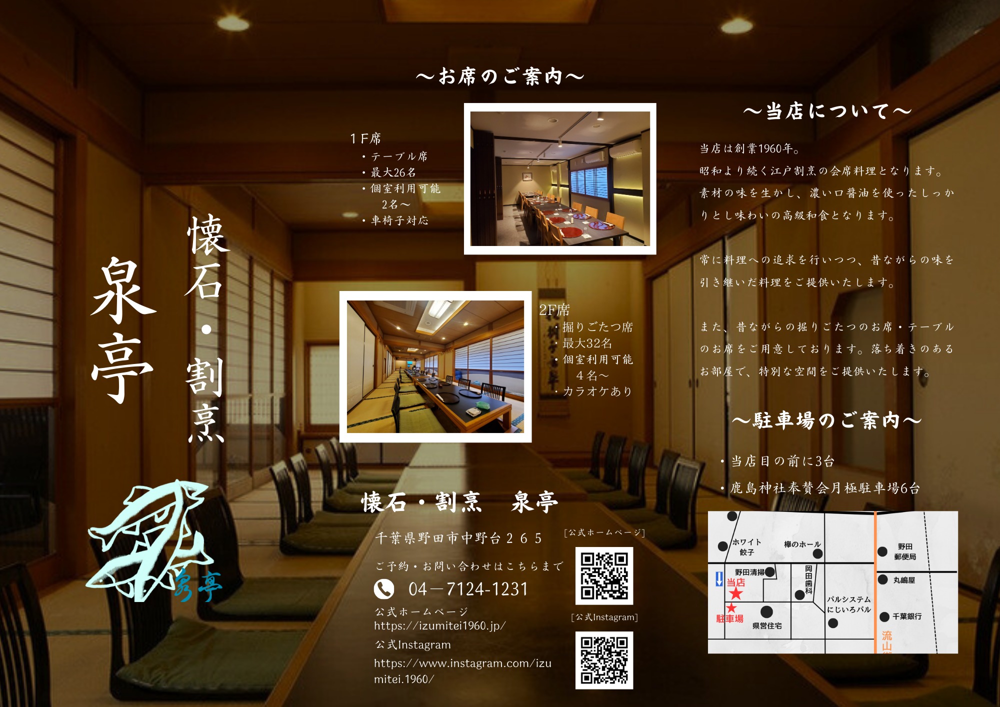 ご予約・お問い合わせはTEL・ホームページ・InstagramのDMにて受け付けております。 お気軽にお問い合わせくださいませ。 #日本料理 #懐石料理 #レストラン #老舗 #千葉県 #野田市 #愛宕駅 #野田市駅 #コース料理 #ランチ #ディナー #出前 #個室 #完全個室 #テーブル #掘りごたつ #隠れ家 #新年会#忘年会#接待#法事#顔合わせ#お喰い初め#七五三 #季節の料理 #旬の食材 #魚料理#刺身 ―――――――――――――――――――――――――― 懐石・割烹 泉亭 住所:千葉県野田市中野台265 Tel;04-7124-1231 ホームページ:https://izumitei1960.jp/ ヒトサラサイト:https://hitosara.com/0006077712/ ――――――――――――――――――――――――――